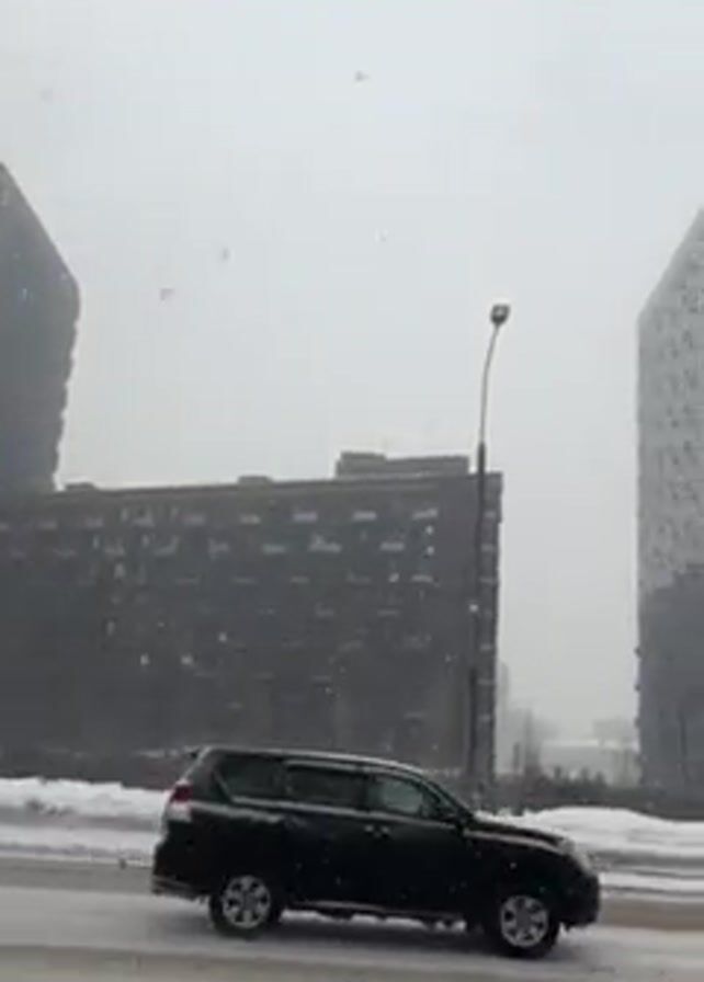 street scene during a light snowfall. The road is lined with snow, and there are several tall buildings in the background. Two high-rise buildings with white facades can be seen at the end of the video. A streetlight is visible on the right side of the frame. Cars can be seen driving on the snowy road.