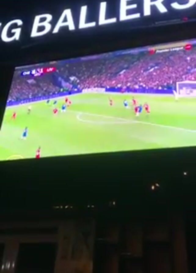 A video shows a Chelsea vs Liverpool soccer game being displayed on a large television screen. The screen is under a sign that reads "Young Ballers". A soccer game is in progress. The Chelsea team is wearing blue, and Liverpool is wearing red. The score is Chelsea 2, Liverpool 1. The game is in the Premier League.