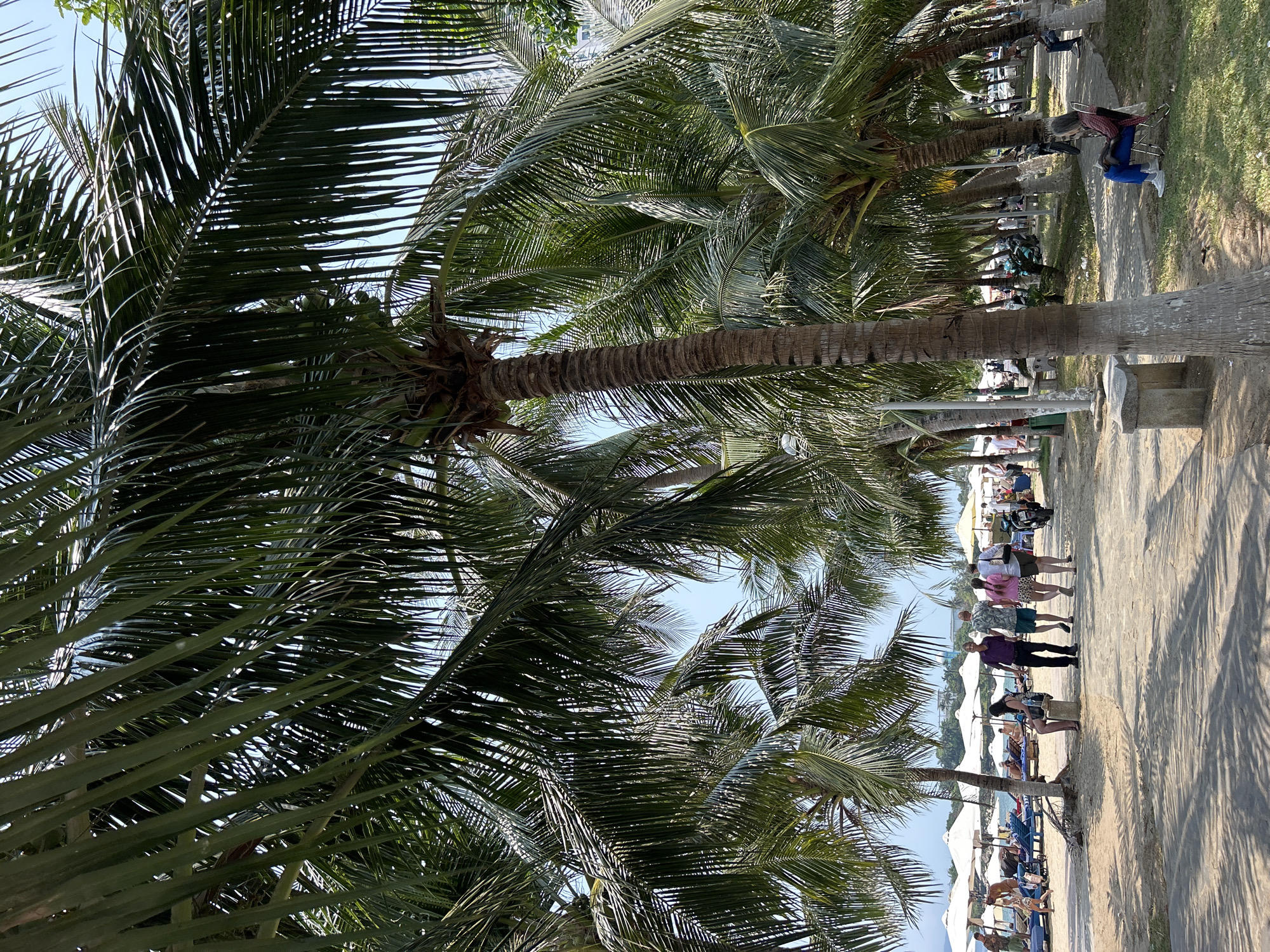 A vertical image shows a sunny day at a beach in Bắc Nha Trang, Vietnam. Palm trees heavily dominate the frame, with many fronds filling the foreground and midground. A sandy path runs alongside the palm trees, and people are visible walking and relaxing. Some people are walking along the path in groups, while others are seated on beach chairs under white umbrellas near the water. The sky is visible through the palm fronds in patches of light blue. The overall impression is that it is a warm and relaxing day at the beach.