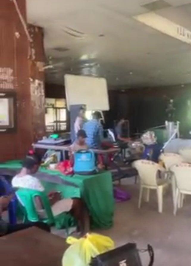 interior of a large, somewhat dilapidated room that appears to be under preparation for some kind of event or performance. There are several people present, some seated and some standing around tables with equipment. A man is playing drums on a drum set towards the back of the room. Several white plastic chairs are arranged in rows on one side. The room has peeling paint and worn-looking walls. Light enters through windows and open areas, illuminating the various objects and people within the space. There is a whiteboard on a stand and other items scattered about, suggesting an ongoing setup process.