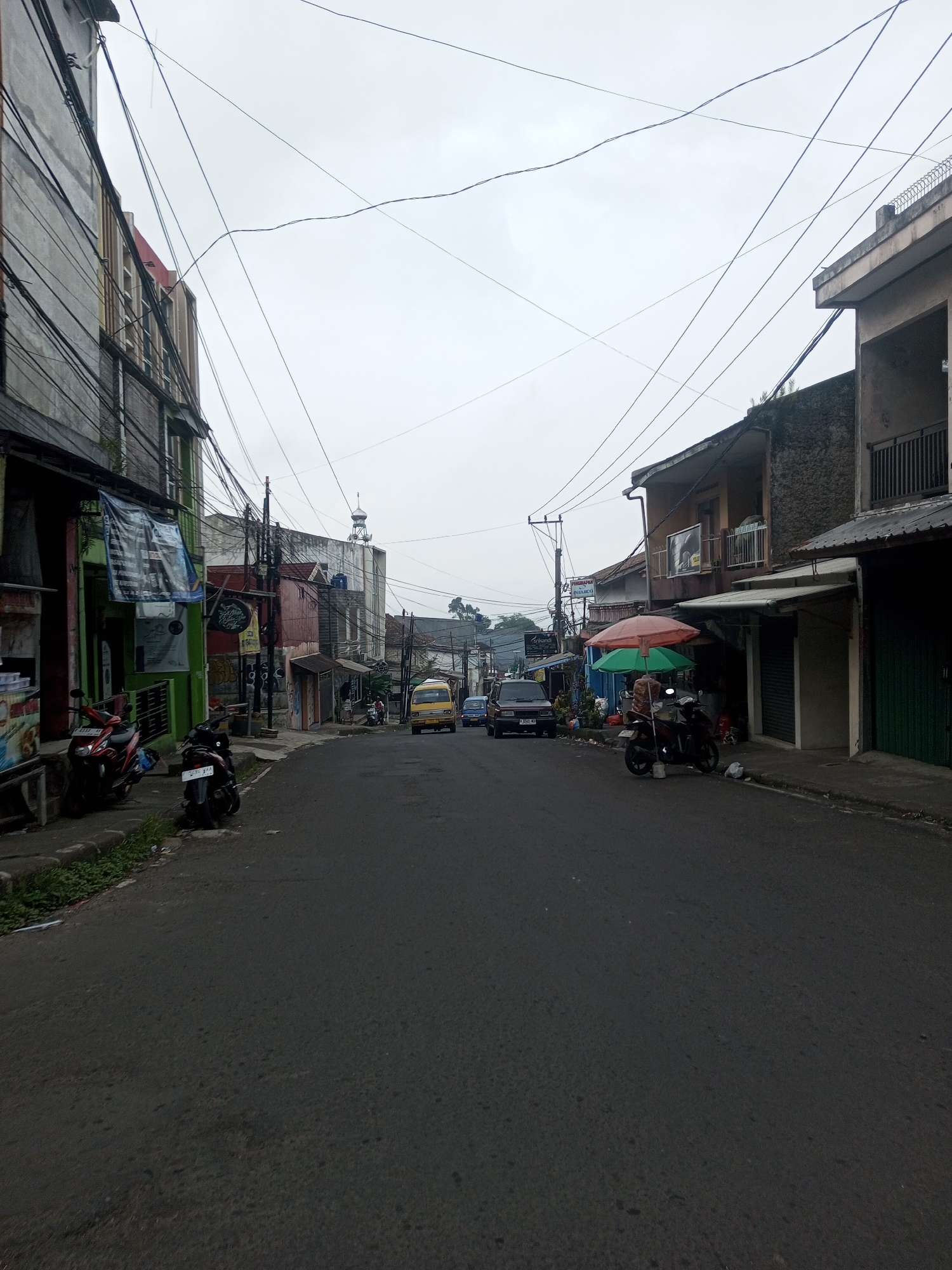 This image depicts an overcast street scene in Houaythat, Laos, captured from a low vantage point looking down a paved, two-lane road that curves slightly to the right in the distance. The sky is uniformly light grey. On the left side of the street, multi-story buildings with varied facades line the sidewalk. The nearest building is predominantly grey concrete with numerous black electrical cables running vertically along its exterior. A green awning and a blue banner are affixed to its lower section. Two motorcycles, one red and one black, are parked on the sidewalk near this building, which also shows signs of weeds growing from cracks. Further down the street on the left, other buildings display colors like pink, white, and various shades of grey, with exposed brick or concrete textures. A white building in the mid-distance features a small, minaret-like tower on its roof. The right side of the street is also bordered by multi-story buildings. The closest building has a light brown upper facade with a balcony enclosed by white railings, and a lower section with dark, stone-like textured cladding. A shop with a dark green roll-down shutter is visible beneath it. Further along this side, two large, colorful umbrellas, one orange and one green, are set up on the sidewalk, partially obscuring a person standing beneath the green umbrella, facing away from the camera. A dark motorcycle is parked nearby. Another dark-colored SUV is parked on the road further down on the right. The asphalt road surface appears dry and displays some minor texture variations. Overhead, a dense network of black electrical and communication wires crisscrosses the scene, connecting to power poles and buildings. In the mid-distance, a yellow van is visible on the left side of the road, followed by a dark car and a light blue car. Another individual is partially visible riding a scooter further down the street on the left. The general environment suggests a bustling commercial or residential area.