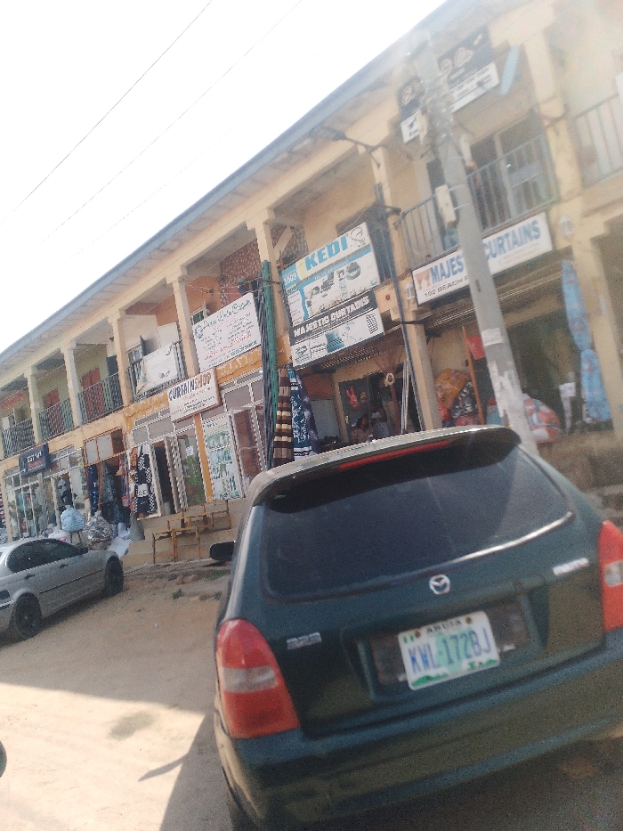 An outdoor, sunlit street scene depicts the commercial area of 102 Beach Road, Jos, Nigeria. In the immediate foreground, the rear of a dark green Mazda hatchback, bearing an Abuja license plate KWL-172BJ and equipped with a rear spoiler, is angled towards the viewer. To the left, a silver BMW sedan with black wheels is parked on an unpaved road shoulder. The mid-ground features a two-story commercial building housing multiple storefronts on the ground level and an open-air balcony walkway on the upper floor, supported by light-colored columns. Prominent signage on the building includes "KEDI," "MAJESTIC CURTAINS (102 BEACH ROAD)," and "CURTAIN SHOP." Merchandise, including textiles, is displayed outside the shops. Several individuals are present, with one person in a light-colored top standing near the parked BMW, and another seated inside one of the shops. A dark utility pole with numerous cables is situated on the right side of the frame. The ground is unpaved, consisting of dirt and aggregate, with harsh shadows indicating strong overhead sunlight.