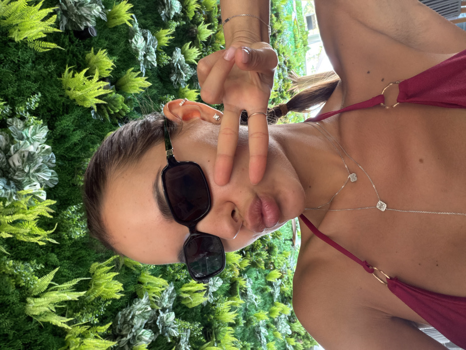 A close-up photograph captures a female subject in the city of Kathu, Thailand. The subject is positioned against a vertical green wall composed of various artificial or live foliage. She wears dark, rectangular sunglasses with a subtle green pattern on the temples and a maroon halter-neck top featuring a gold-colored ring on the left strap. Her dark hair is pulled back, with a braided section visible over her right shoulder. Her lips are pursed, and a small stud is visible in her left nostril. The subject's right ear displays a square stud earring and an upper helix cuff earring. Two silver-colored necklaces adorn her neck: a shorter one with a small, white, four-leaf clover pendant, and a longer Y-shaped necklace featuring a square, clear gemstone pendant. A thin band ring is present on her left ring finger, and a delicate bracelet is visible on her right wrist. Her left hand is raised near her face, with the index and middle fingers extended in a "peace sign" gesture.