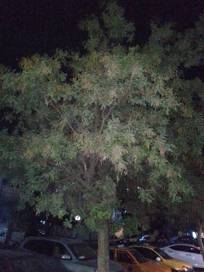 The image displays an outdoor, nighttime scene within Barza Municipality, Syria. A large deciduous tree with a dense canopy of green foliage occupies the majority of the frame, extending from the lower center upwards. Several parked passenger vehicles are visible beneath and around the tree. These include a dark-colored vehicle on the left, a light brown/orange sedan positioned in the center-right, a yellow sedan partially visible to its right, and a white sedan further to the right. The background is dark, with indistinct artificial lights visible, indicating an urban setting. No individuals, discernible actions, or interactions are present.