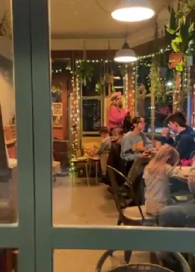 From an exterior view through a window, a brightly lit interior reveals a group of people gathered. Several children are present, one of whom is walking around in the background. An adult in a pink jacket stands near the back. The room is decorated with hanging plants, and string lights are strung around the perimeter. Tables and chairs are visible, and several people are sitting and interacting with each other. The window frame is dark green.