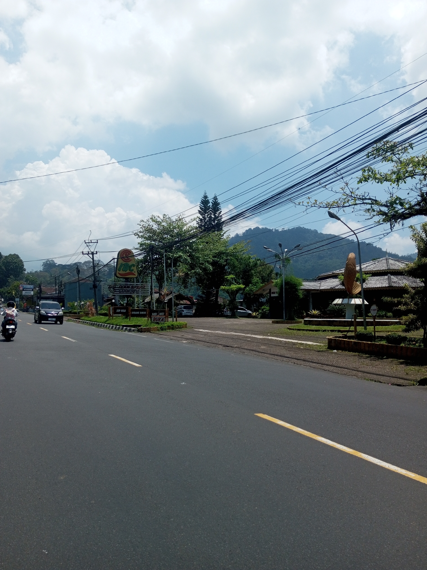 street in a mountainous region, possibly near Nawng Hkar, Myanmar, given the landscape and architectural style of the building to the right. A black car is driving on the road along with a motorcycle, and there are signs for JRC restaurant. There are electrical wires overhead, and mountains are visible in the background.