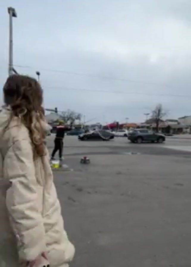 person making large bubbles at a street corner. The person is standing on the asphalt next to a bucket and a small stand and waving a wand to create the bubbles. Cars pass by on the street and pedestrians walk by. The sky is overcast.