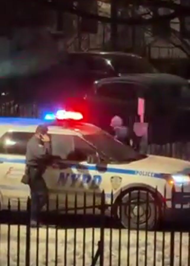 At night, an NYPD police officer stands by the driver's side door of a parked police car, which has its red and white lights flashing. The officer is holding something to his ear, possibly a phone or radio. The scene is partly obscured by a dark metal fence covered in snow. Behind the police car, another vehicle is parked. It appears to be winter, given the presence of snow on the ground and the leafless trees in the background. The lighting in the scene is dim, mostly illuminated by the police car's flashing lights and a distant street lamp.