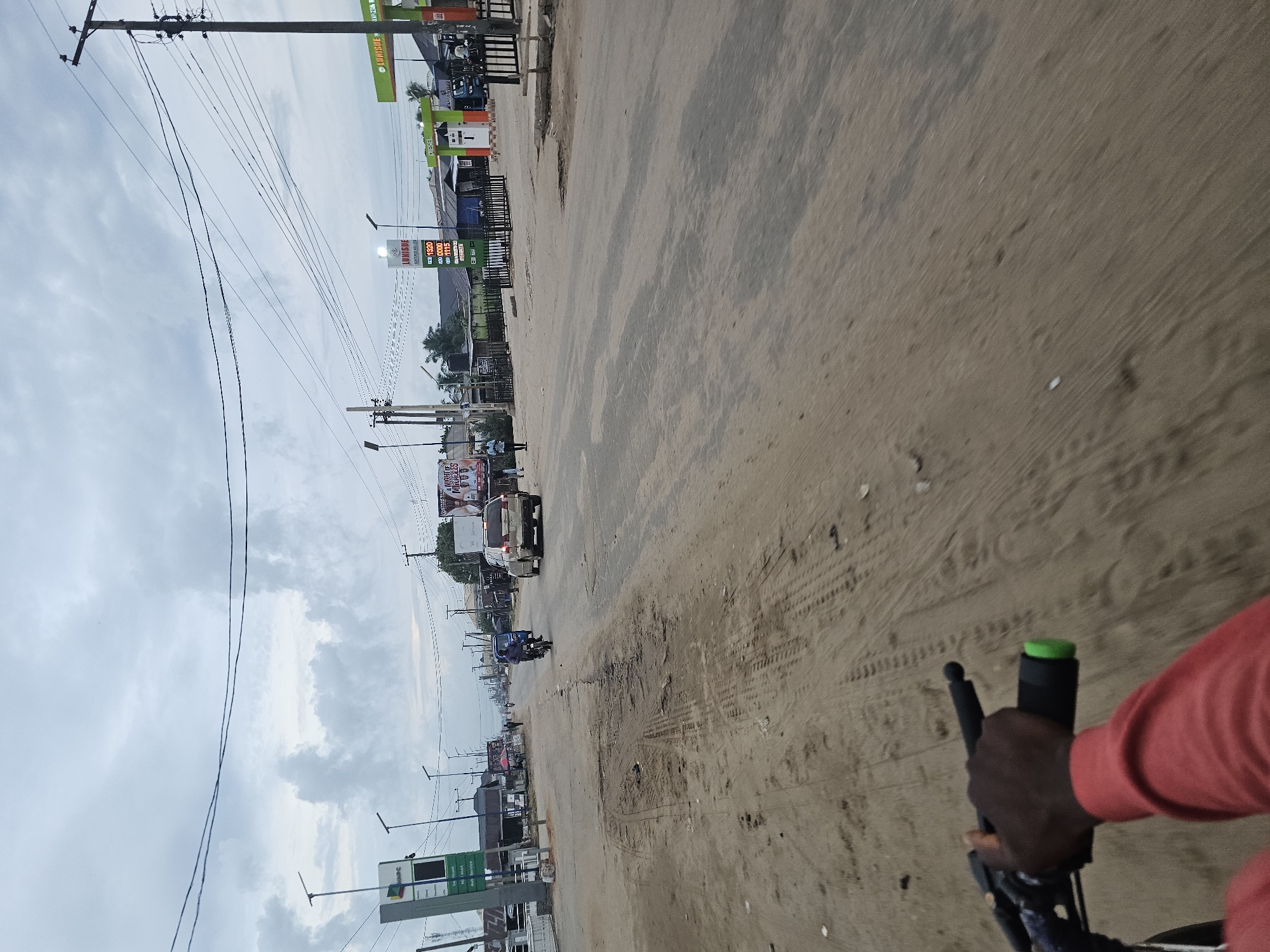 The image captures a street scene, likely from the perspective of someone riding a bicycle or motorcycle. The road is wide, appears to be paved but not in perfect condition. It shows signs of wear and has tire tracks and some loose material. Along the side of the road, there are various buildings and structures, including what appear to be gas stations with price signs visible. Utility poles with numerous wires run along the roadside. In the distance, there are vehicles, including cars and motorcycles, moving along the road. The sky is overcast with cloudy weather. The foreground shows part of a bicycle handlebar with a hand gripping it. The location of the scene is Unknown.
