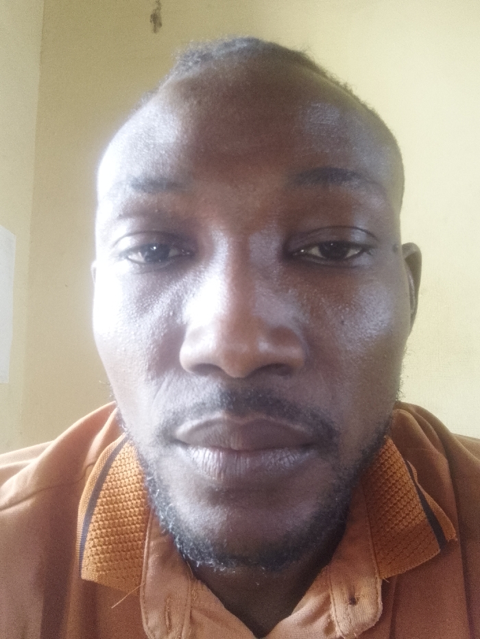 This image is a close-up, frontal portrait of an adult male, located indoors in Sabon Tasha, Nigeria