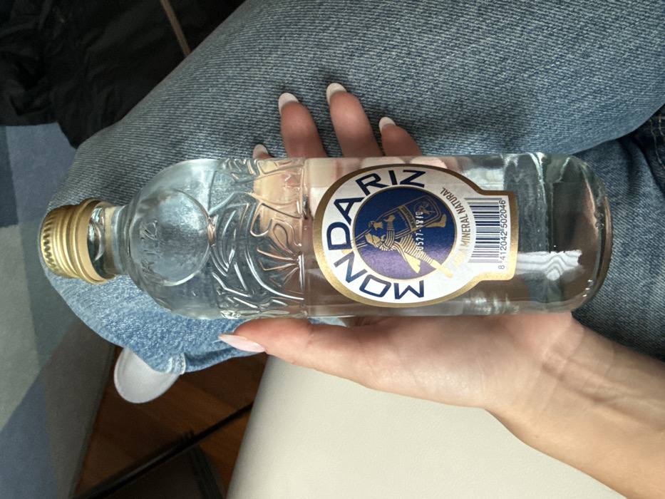 - "A person's left hand, with light skin tone and French-tipped fingernails, holds a clear glass bottle of Mondariz natural mineral water" by FM-qzRJ63, licensed under CC BY 4.0