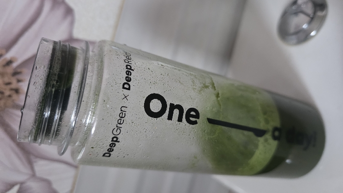 A transparent bottle, likely plastic, containing a two-toned green liquid, stands on a white surface in an unknown location in Unknown city, Unknown state/country. The liquid at the bottom is dark green, transitioning to a lighter, foamy green layer above. Condensation is visible on both interior and exterior surfaces of the bottle's upper half. Black lettering on the bottle reads "DeepGreen x DeepRed" horizontally near the rim and "One" oriented vertically with an accompanying vertical line. The bottle's screw-top rim is exposed, showing no lid. A partially visible chrome circular drain or fixture is present on the white surface to the right of the bottle. The background features a blurred wall with a light pink and brown floral pattern, consistent with an indoor environment. No individuals are present in the scene.