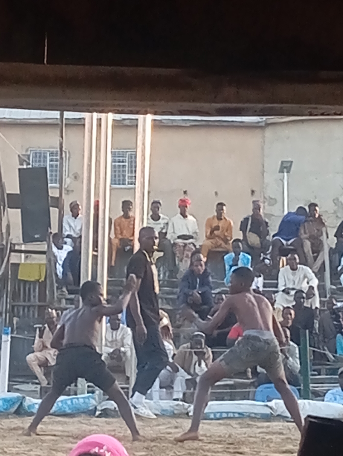 Two shirtless men are engaged in a boxing match on a sand-covered area. A man in a black shirt stands between them, possibly acting as a referee. Spectators sit on tiered seating in the background, some in traditional attire. A building with barred windows is visible behind the crowd. The scene appears to be outdoors with a simple setup for the boxing event.