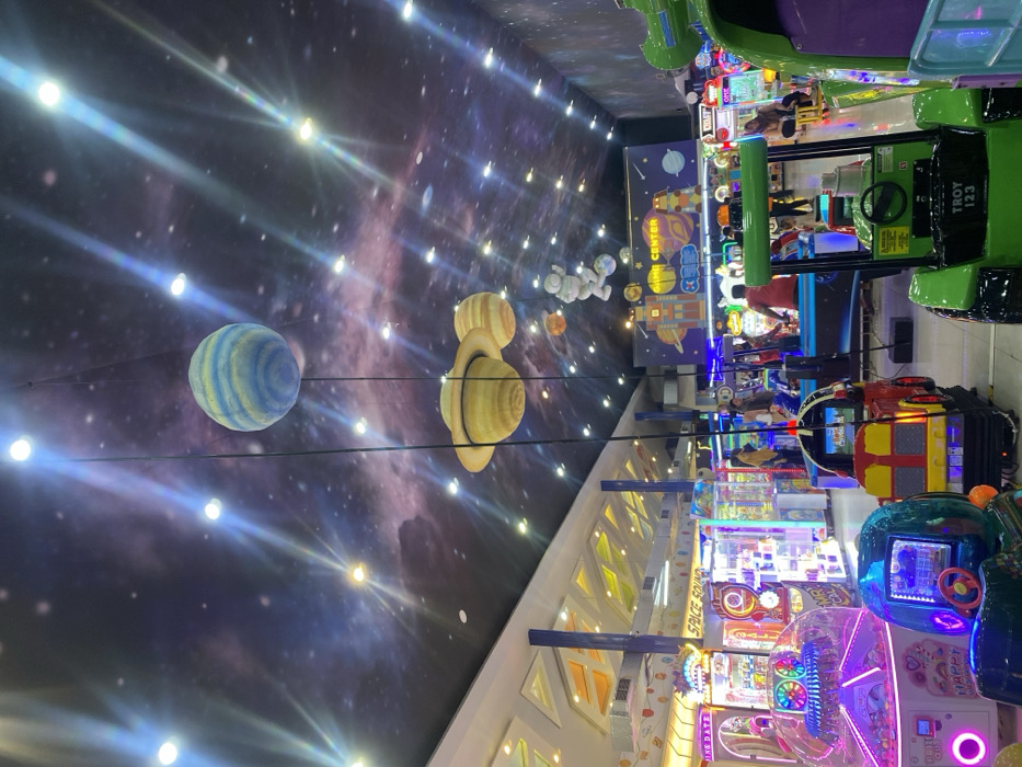 An indoor amusement center in Kecamatan Pati, Indonesia, is presented, featuring a space-themed decor