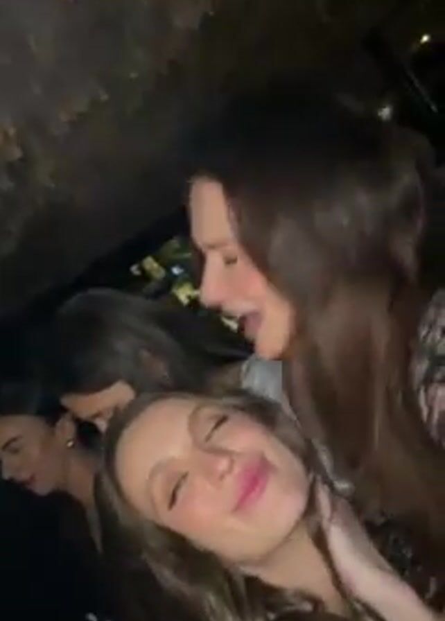 group of people in what appears to be a dimly lit, crowded party or club setting. The primary focus is on two women, one with light brown hair and another with darker hair, possibly brunette. They are standing close together, taking selfies, hugging, and kissing. The woman with darker hair puts her head on the other woman's head. Other people are visible in the background. The lighting is low, creating a club-like atmosphere.