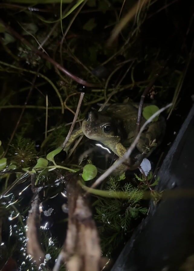 A frog is sitting in a body of water amongst grass and small green plants. The video is dark, with only the frog’s eye catching some light.