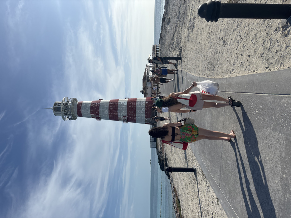 A seaside scene shows a striped lighthouse towering next to a walkway. Two women, one in green shorts and another in red shorts, stroll along the paved path. A crowd of people mills around in the background. The sky is light blue with scattered clouds. A dark post stands on the edge of the walkway, near the sea.
