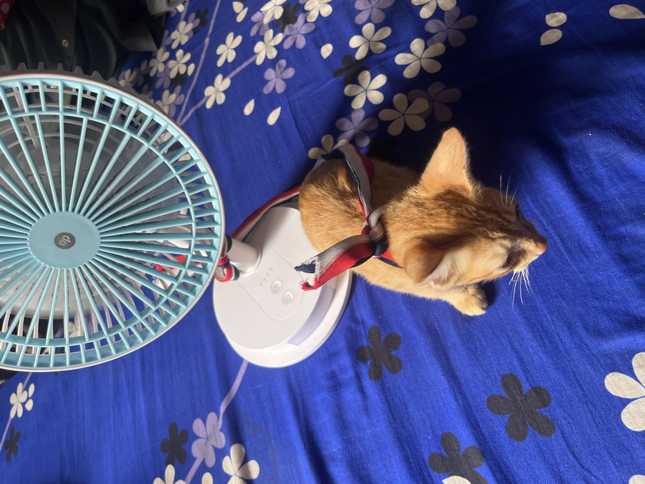An orange kitten, wearing a red, white, and black striped ribbon or harness, is positioned on a dark blue sheet patterned with white and light blue flowers. The kitten's head is lowered, looking towards the foreground. To the upper left of the kitten, a light blue portable desk fan with a white base and "dp" branding is visible. The fan is operational, indicated by the visible blades through its grill. Bright ambient light illuminates the scene, consistent with an indoor setting in Gwagwalada, Nigeria.