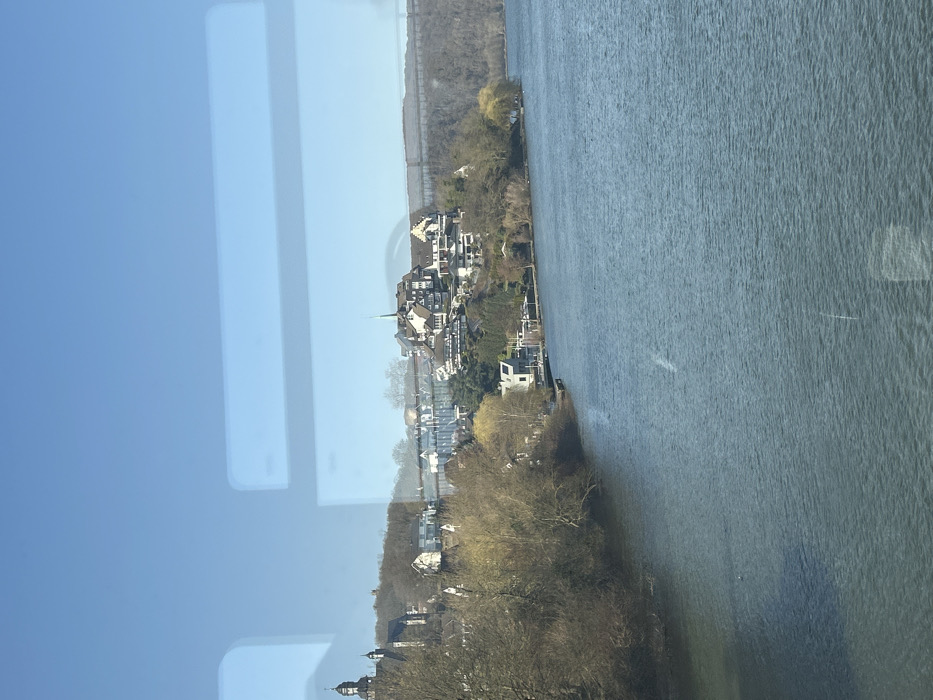 The image captures a panoramic view of the Lenne River in Hohenlimburg, a district of Hagen, Germany, under a clear, bright blue sky. The lower half of the frame is dominated by the wide, placid body of water, which appears grey-blue with subtle surface ripples. Distinct rectangular light reflections and streaks from a transparent surface, likely a window, are visible across the water and midground. The left bank of the river is densely vegetated with leafless deciduous trees and shrubs, some exhibiting early spring growth with faint yellow-green foliage. Along the midground, the terrain rises sharply from the riverbank, showcasing a developed hillside. On the far left, a substantial stone building with a dark, domed roof and a smaller spire is identifiable as St. Michael's Church. Further to the right, a cluster of buildings, varying in architectural style, ascends the hillside. Among these, a prominent structure with a tall, slender, green-topped spire is visible, characteristic of Hohenlimburg Castle or a significant church within the historical town center. Closer to the water's edge on the right midground, several modern, light-colored residential structures with flat or low-pitched roofs are interspersed with more traditional buildings. Small pier-like structures extend into the water from this bank. In the upper right background, a long, dark, linear structure spans horizontally across the landscape, identified as the Lenne Viaduct (Lennebrücke). The sky above is uniformly clear and cloudless. No individuals or discernible actions are present in the scene.