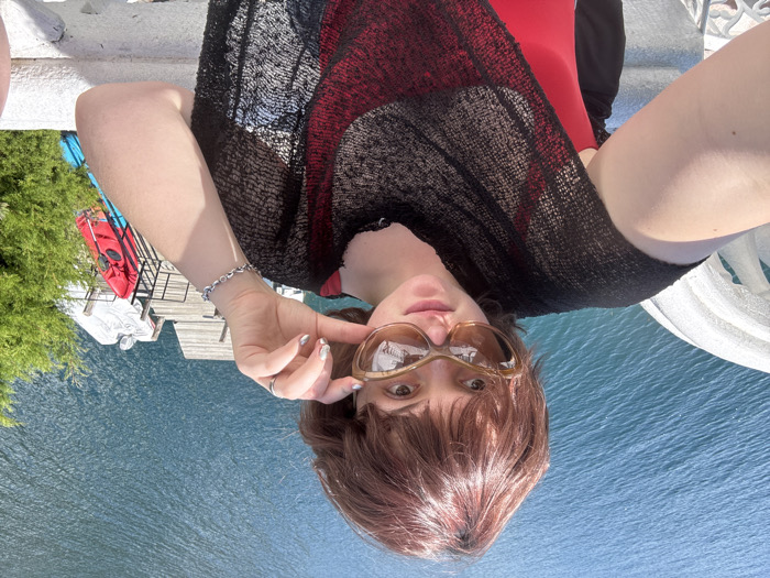 A person with brown hair, sunglasses, a red top, and a black cover-up poses in front of a body of water. A dock with boats and kayaks is visible behind them. They wear a silver bracelet on their left wrist and hold the sunglasses with their hand. A white railing is also visible.