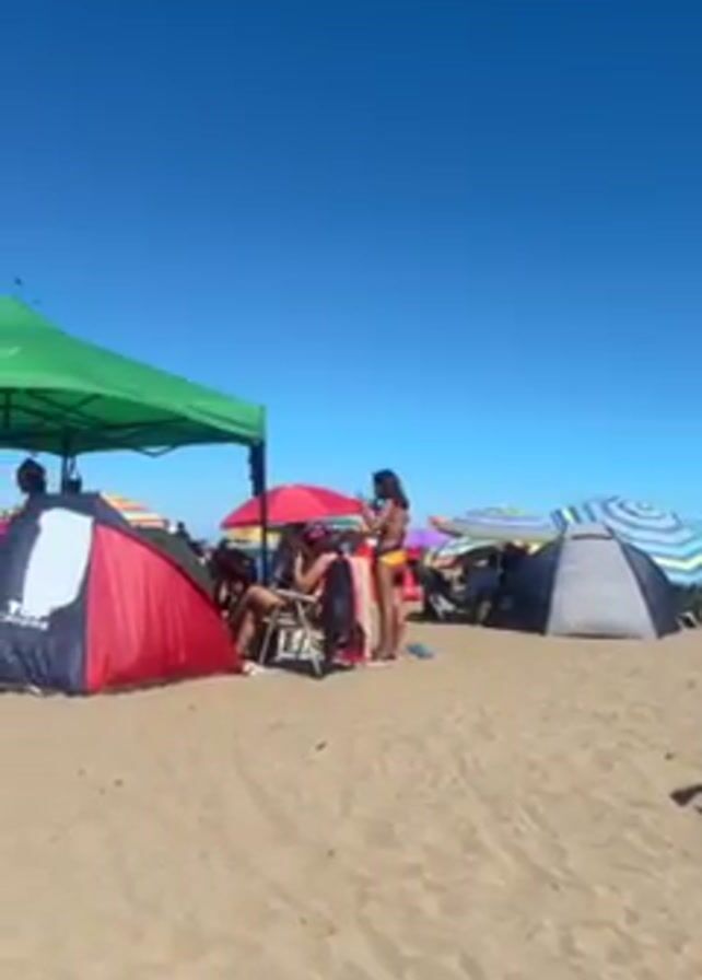 sunny beach scene with people relaxing and socializing. There are several colorful beach umbrellas and tents dotting the sandy landscape. People are sitting in chairs, standing around, and walking across the beach. Some individuals are wearing swimwear. The sky is clear and blue.