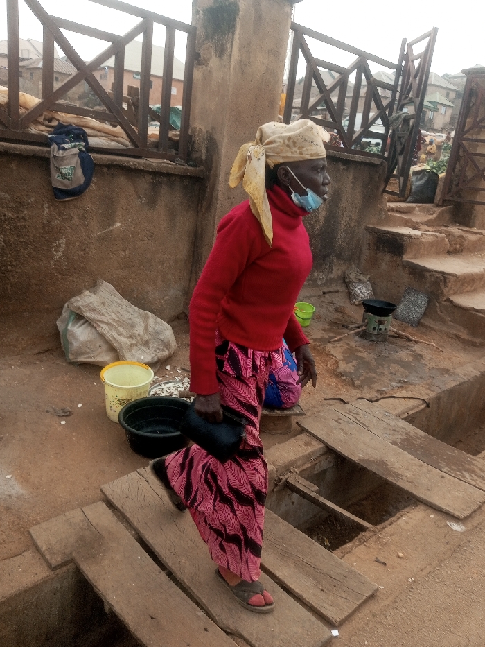 An elderly woman in a red sweater, patterned skirt, and headscarf stands near a makeshift well. She wears a blue face mask and holds a black bag. The well, covered with wooden planks, sits on a raised platform with steps. A blue bag hangs on the wall in the background, along with buckets and other items scattered around. The setting is rustic with buildings visible in the distance.