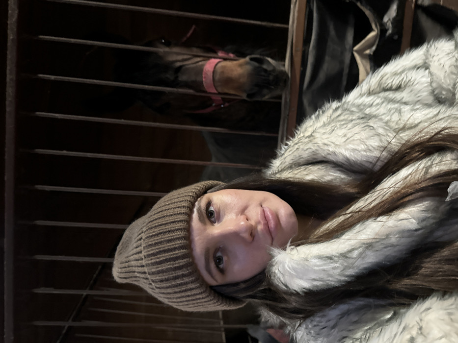 The image depicts a woman and a horse inside a stable, located in Kalinovo, Russia. In the foreground, a woman with long, dark brown hair wears a light brown ribbed beanie and a grey and white faux fur coat. She has a neutral facial expression and is looking directly forward towards the camera. Behind her, separated by dark vertical metal bars, the head and partial neck of a dark brown horse are visible. The horse wears a pink halter and its eyes are directed towards the camera. The background consists of dark wooden stable walls and dark fabric materials.