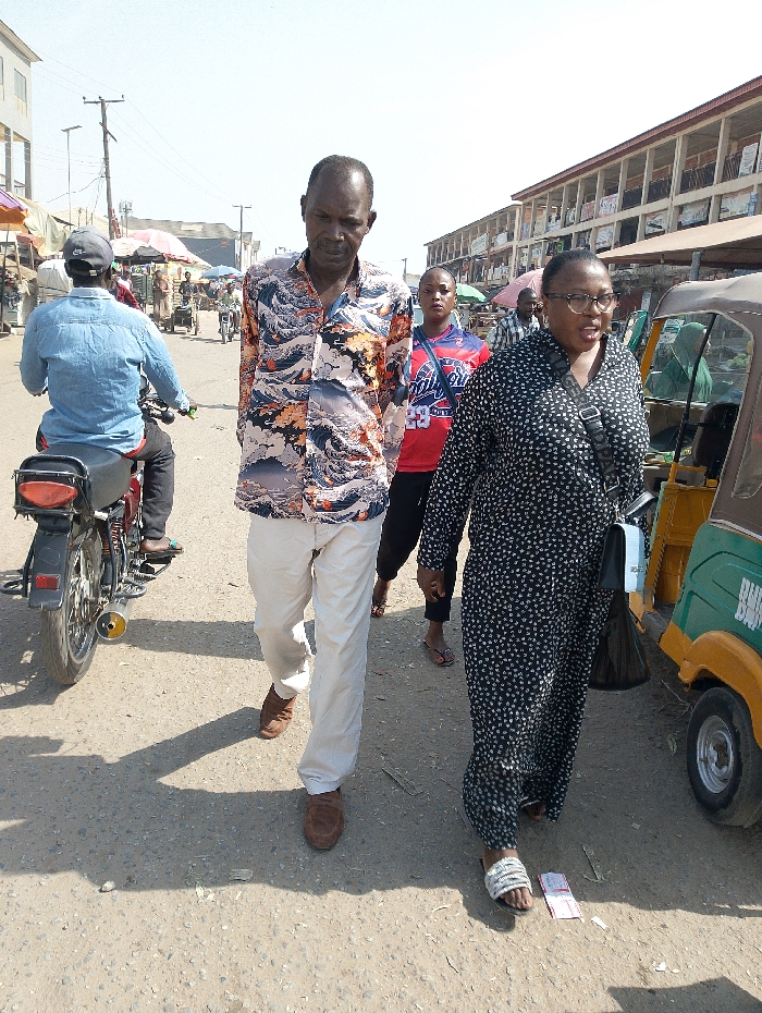 This image depicts a bustling street scene in Kubwa, Nigeria, under clear, bright daylight. In the foreground, a dark-skinned man with short dark hair walks forward, looking slightly downward and to his right. He wears a long-sleeved shirt with a complex pattern of blue, white, orange, and black wave-like designs, light beige trousers, and brown loafer-style shoes. To his right, a dark-skinned woman wearing eyeglasses walks in the same direction, with her mouth slightly open. She is dressed in a full-length black dress with a small white pattern and white patterned slip-on sandals. A black shoulder bag with a white strap hangs across her body. Two small, white and pink paper items lie on the asphalt directly in front of her feet. In the mid-ground, slightly to the left of the main man, a dark-skinned man wearing a light blue denim-style shirt and a grey baseball cap is seated on a dark-colored motorcycle, facing away from the viewer. The motorcycle's rear wheel, exhaust pipe, and red taillight are visible. Between the main man and woman, a partially obscured individual in a red t-shirt with a blue graphic is also walking. On the far right, the front quarter of a green and yellow three-wheeled auto-rickshaw (Keke Napep) is visible. The background shows a street lined with multi-story buildings, including a long, open-fronted structure on the right, possibly a market building, featuring multiple balconies or stalls. Various market stalls with umbrellas and numerous pedestrians are visible further down the street. Utility poles with overhead wires span the scene. The road surface is asphalt, and strong shadows indicate a high sun angle, suggesting midday.