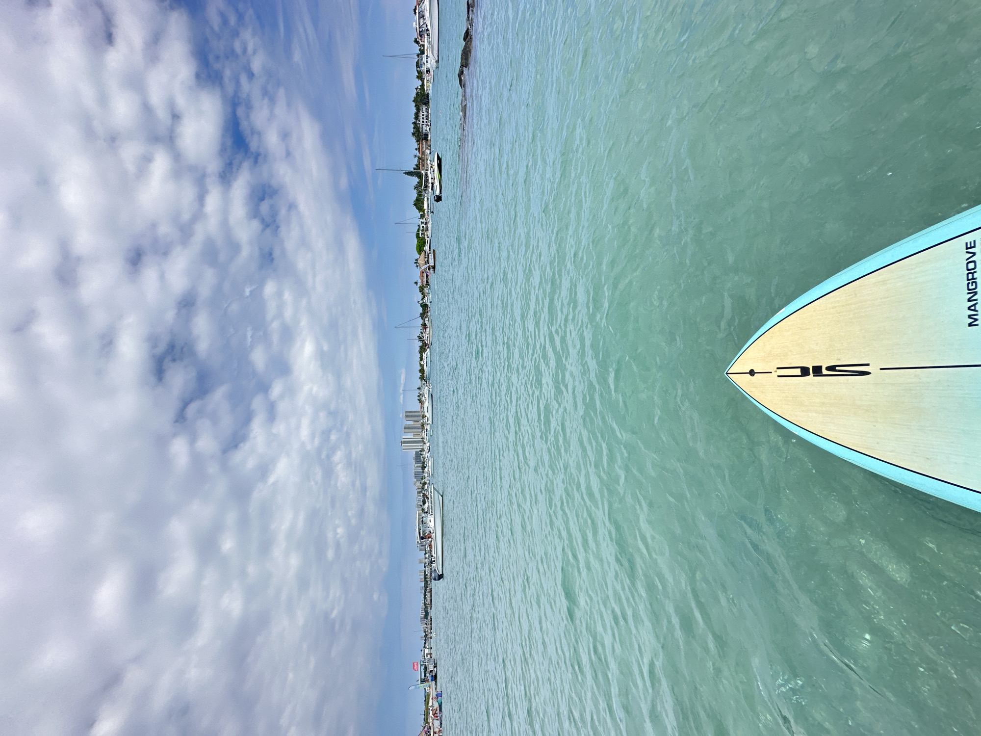 The image displays a waterscape viewed from the bow of a wooden-toned paddleboard, featuring light blue trim and branded with a black "SIC" logo and "MANGROVE" text. The paddleboard rests on clear, rippled, turquoise-green water, where the submerged bottom is visible in sections. In the mid-distance and background, numerous recreational vessels, including motorboats and sailboats, are anchored or moored across the waterway. A white center-console motorboat, carrying several individuals, is centrally prominent in the midground. To the far left, a gathering of people is visible on a shallow sandy area or beach, near a red and white canopy structure. The distant horizon reveals a skyline of light-colored high-rise buildings and a residential shoreline adorned with houses and palm trees. A line of dark, partially submerged rocks extends into the water on the right. The sky overhead is partially covered by scattered white cumulus clouds against a blue background. This scene is located in a waterway within or adjacent to Palm Beach Shores, United States of America.