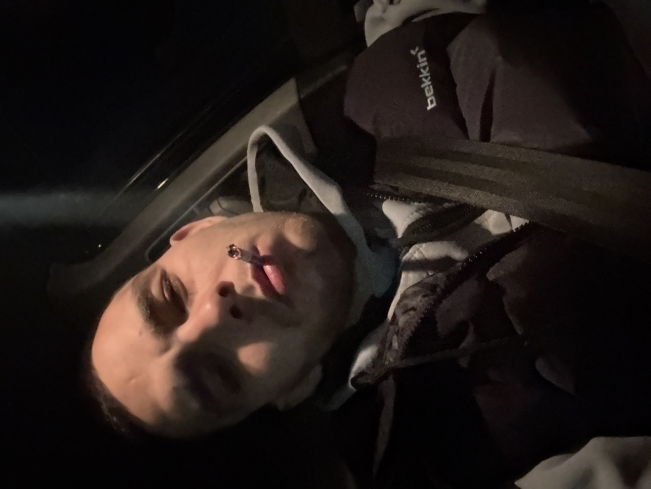 A male individual is depicted in a dimly lit, dark environment, consistent with the interior of a vehicle at night