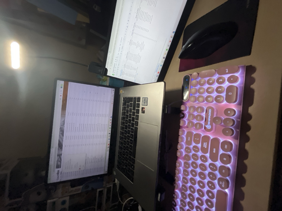 The image depicts an indoor computer workstation in the city of San José Pinula, Guatemala. The scene is dimly lit by ambient light, supplemented by two illuminated screens and a desk lamp. A silver-grey laptop with a dark keyboard is positioned centrally on a stand, its screen displaying a web browser window titled "CoolView" with tabular data, likely a list or database entries. An AMD Ryzen sticker is visible on the laptop's palm rest. To the right of the laptop, an external flat-panel monitor is oriented vertically, displaying a spreadsheet application with multiple columns of data including headers like "Product ID" and "Property Type." A backlit keyboard with circular, pink keycaps, emitting a pink/purple glow, is positioned directly in front of the laptop. The brand "SHIPADCO" is visible on the spacebar. To the right of the keyboard, a black optical mouse rests on a black mousepad. A flexible-neck LED desk lamp, featuring a rectangular light panel, is clamped to the right side of the desk, emitting a bright white light that illuminates the external monitor and adjacent desk area. The equipment rests on a light brown desk surface. The background is dark and out of focus, with indistinguishable objects vaguely visible on the left and a hint of a light blue object on the far right. No individuals are present in the frame.