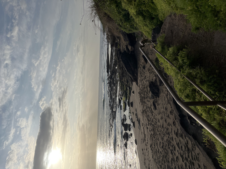 A scenic coastal view depicts a beach meeting the ocean under a partly cloudy sky. Sunlight reflects off the water's surface. A sandy shore is bordered by rocks and greenery. A metal railing runs along the edge of a path or walkway, providing a boundary between the vegetation and the beach below.