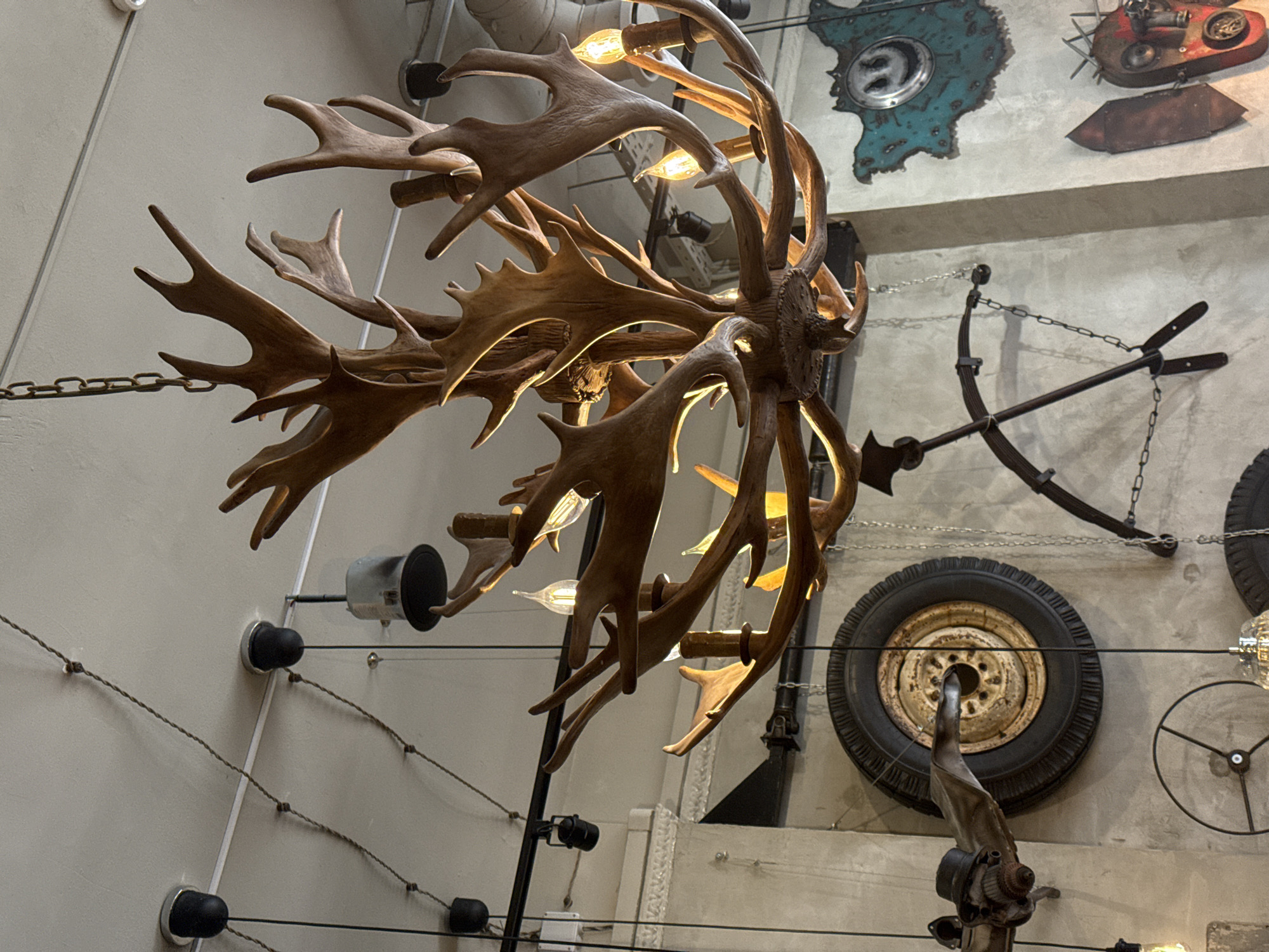 A wide-angle interior shot displays a complex arrangement of objects against a textured gray wall. Prominently featured is a large, decorative chandelier made of what appears to be antlers, interspersed with light bulbs. Attached to the wall behind the chandelier are several repurposed industrial and automotive-themed items. These include a rusted car wheel, a rusted metal design, a rusted bow, metal pieces, and a section of machinery with what looks like a propeller. Electrical wiring and chains are visible, running along the wall and adding to the industrial aesthetic. The wall itself has a textured surface, contributing to the overall rugged and eclectic ambiance. The scene is likely captured inside a commercial establishment like a restaurant or bar, given the design and location. This is likely in the city of Yekaterinburg, Russia.