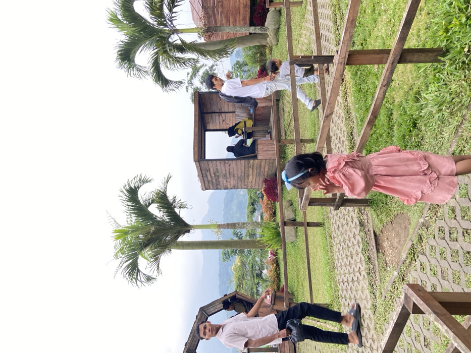 The image captures an outdoor recreational area in Selotapak, Indonesia, under an overcast sky with distant mountains defining the background horizon