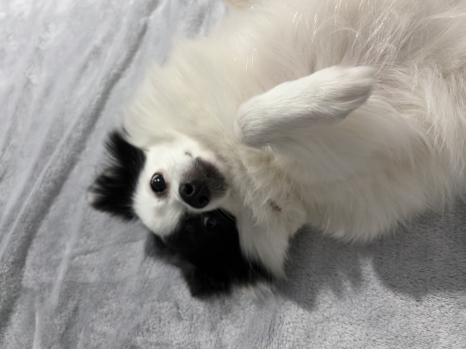 - "A small, fluffy, bicolored canine is depicted lying on its back on a light grey, textured textile surface" by FM-Xb6Dd2, licensed under CC BY 4.0