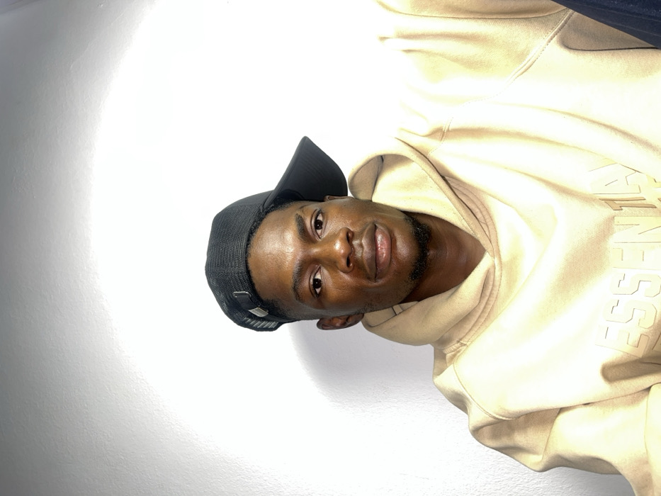 A Black man poses for a selfie, wearing a black trucker hat and a beige hoodie with "ESSENTIALS" embossed on the front