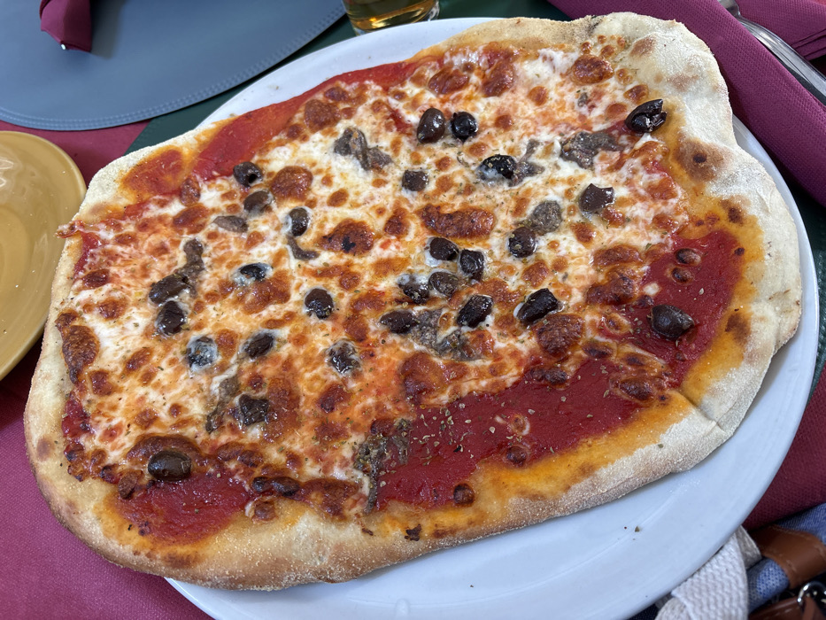 An oblong pizza, approximately 12-14 inches in length, is centrally positioned on a white ceramic plate, occupying the majority of the frame. The pizza is topped with melted, bubbly mozzarella cheese, numerous dark, whole or halved olives, small, elongated pieces of anchovy, and dried herbs visible as small specks. Red tomato sauce is evident in patches, particularly on the left side, beneath the cheese and toppings. The crust is golden-brown with visible areas of charring. The plate rests on a dark red tablecloth. To the upper right, a portion of a light yellow ceramic plate or bowl is visible. To the lower right, a dark green placemat is partially seen, along with a folded dark red napkin and a segment of a clear glass containing a yellowish liquid. A woven white strap and brown leather from a bag are partially visible at the lower left. The scene depicts a meal at a dining establishment in Genoa, Italy.
