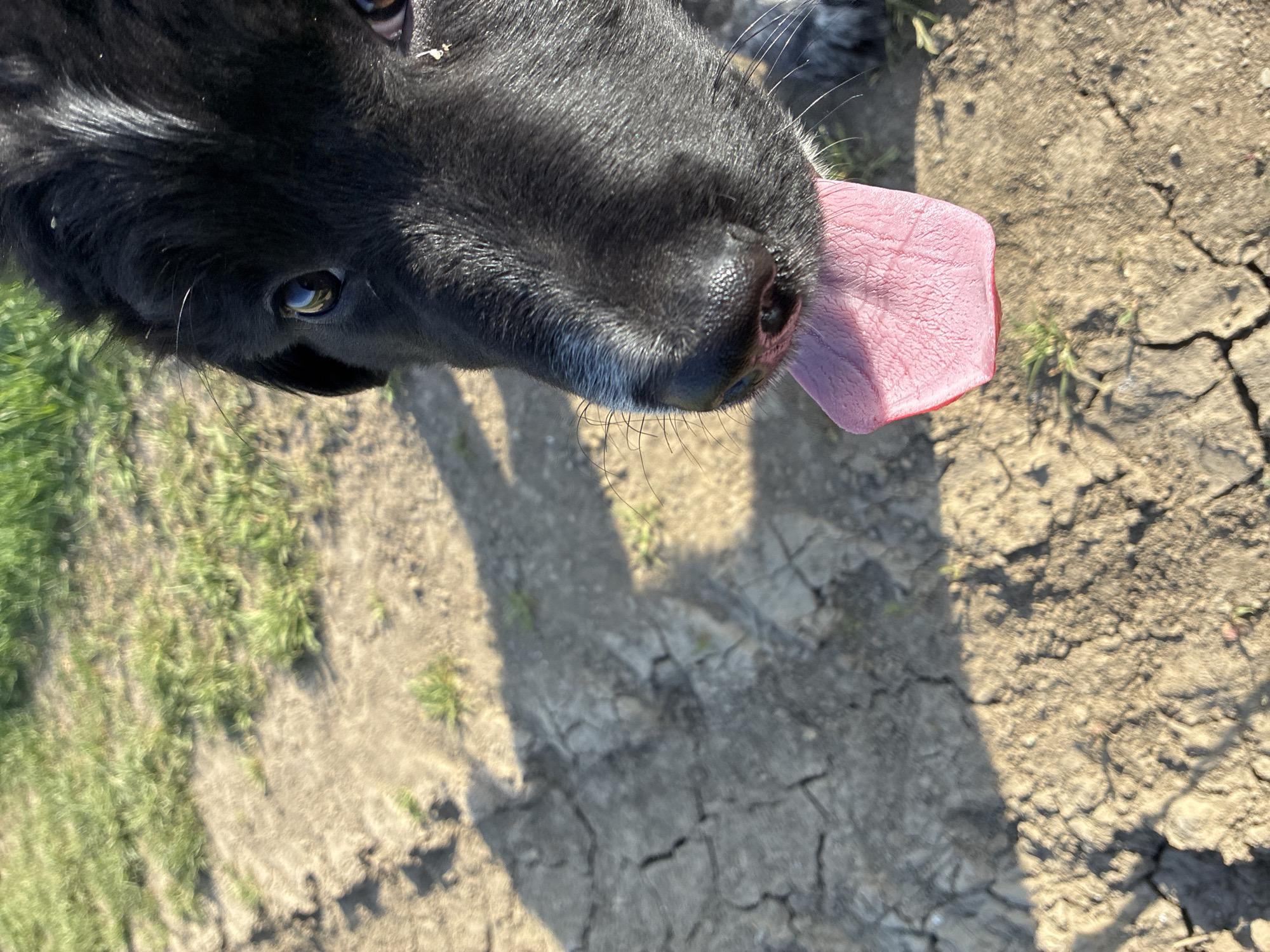 - "A close-up, upside-down image shows a black dog with its tongue extended, standing on cracked earth and sparse grass" by FM-fey6j1, licensed under CC BY 4.0