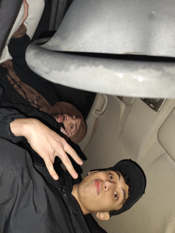 The image depicts two males inside a dimly lit vehicle interior
