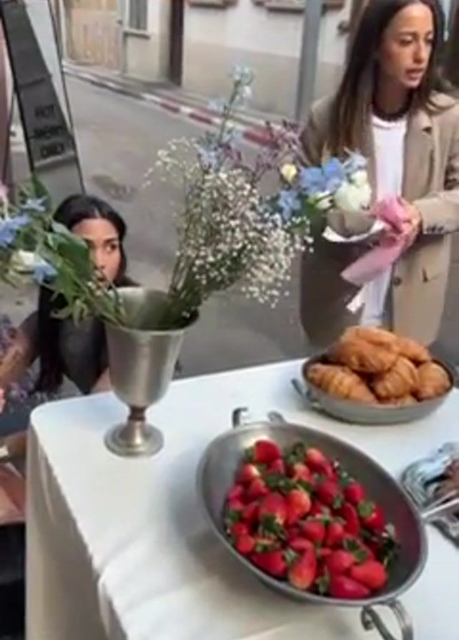 The camera provides a close-up shot of a white table outdoors. The table is adorned with a silver vase containing an arrangement of blue and white flowers. Two metal trays sit on the table: one filled with fresh strawberries and another with croissants. Two women are near the table. A woman wearing a tan blazer stands to the right of the table and is looking off-screen. A second woman, partially obscured, looks at the flower arrangement. In the background, a person can be seen standing in the window of a building. The setting appears to be on a narrow street.
