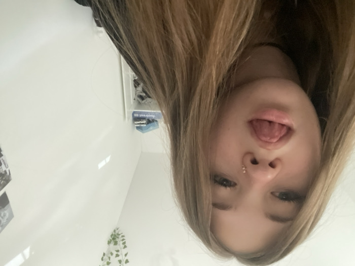 The image displays a young female individual, likely indoors in a residence in Raanana, Israel. The subject has long, light brown hair and light eyes, with a small silver hoop piercing in her left nostril. She is looking directly at the camera, extending her tongue slightly upwards from her mouth. She wears a dark top and a thin dark choker around her neck. The background consists primarily of a plain white wall. In the upper left corner of the frame, artificial green ivy-like foliage is visible. To the left of the subject's head, a white shelf unit holds a blue object partially labeled "footrest" and other dark items. On the right side of the wall, several monochrome photographic prints are partially affixed.