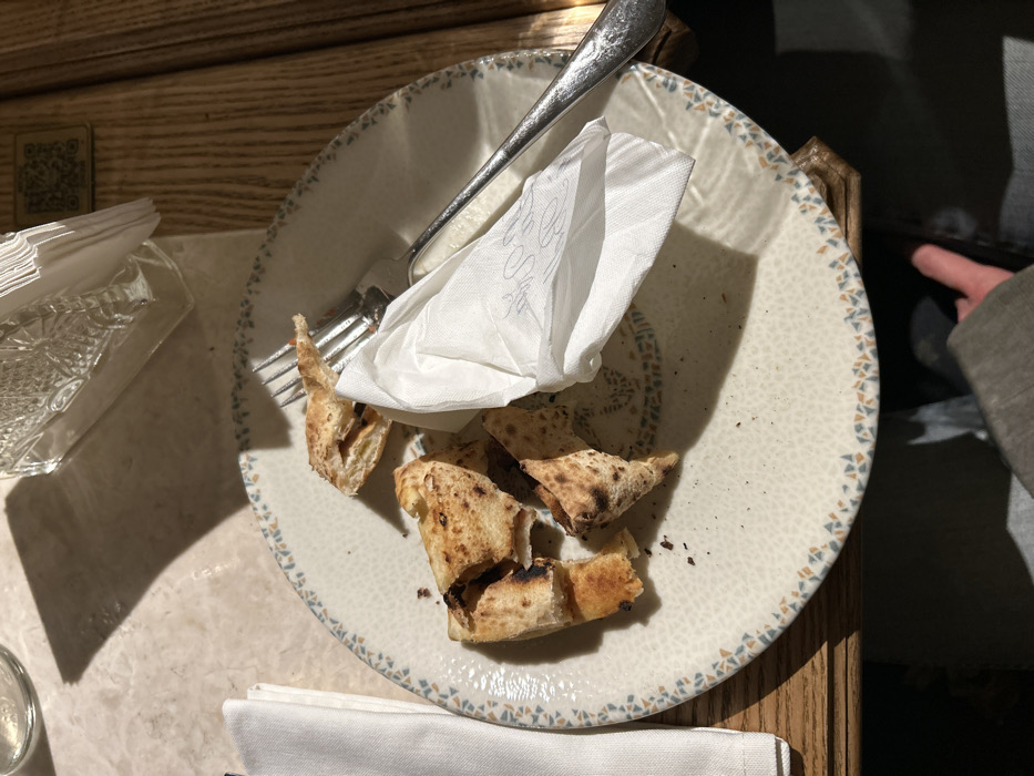 The image depicts an overhead view of a dining table in what appears to be a restaurant or cafe setting. Dominating the foreground is an off-white ceramic plate, bordered with a geometric pattern of small blue and brown triangles. On the plate, several irregularly shaped, partially charred remnants of flatbread or pizza crust are present; one piece shows evidence of a light-colored filling. A silver-colored metal dining fork rests on the plate, partially obscured by a crumpled white paper napkin which bears faint, illegible grey markings. The table surface consists of two distinct materials: a lighter, speckled, possibly marble or granite surface on the left, and a darker, horizontally-grained wooden surface on the right. The plate bridges these two surfaces. To the upper left, the base of a clear glass is visible, casting a shadow. In the upper right quadrant, a clear, cut-glass napkin holder contains white paper napkins. Adjacent to the napkin holder, on the wooden table, a small wooden block features a black QR code sticker. To the far left, a folded white cloth napkin rests on the lighter tabletop. The lower portion of the image shows a person's lap, wearing blue jeans and a grey sleeve, with a finger partially visible, indicating a diner's perspective. Strong, directional lighting from the upper right casts prominent shadows across the table and under the objects. The specific location within the city of Dnipro, Ukraine, such as an establishment name or precise address, cannot be determined from the visual information provided in the image, as the QR code is not decipherable.