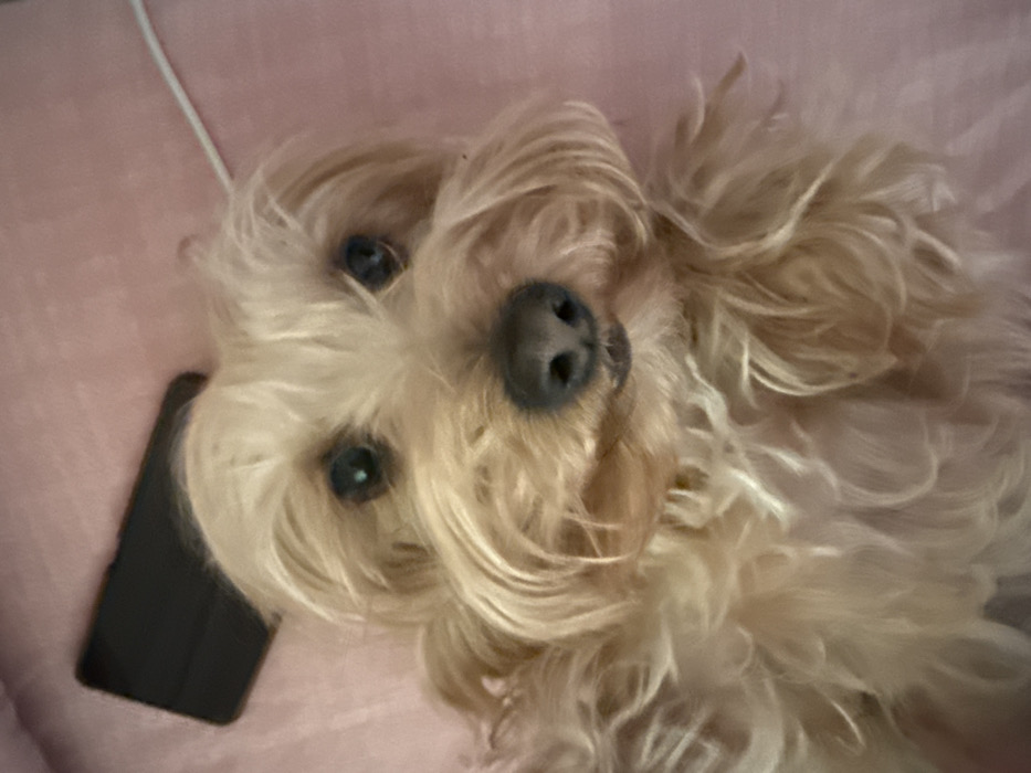 A small, light brown or tan-furred domestic dog, possibly a terrier mix, is depicted in a close-up, upward-facing orientation. The dog possesses dark eyes, a dark nose, and shaggy fur covering its face and body. It appears to be lying on a soft, light pink fabric surface. Positioned behind the dog's head, to the upper left, is a black smartphone, partially obscured by the dog's fur. A thin white cable is visible extending from the upper right edge of the frame onto the pink surface. The scene's specific location within the city of Yambol, Bulgaria, cannot be determined from the visual evidence provided in the image.