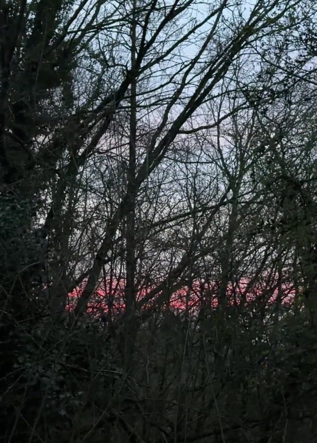 The video depicts a natural outdoor scene with dense foliage in the foreground. The foliage is predominantly dark, possibly composed of trees and bushes, their branches intertwining and obscuring much of the view. Between the dark, silhouetted branches, there's a vibrant display of color in the sky, specifically a horizon painted with a shade of red. This red hue suggests either sunrise or sunset, shining through the gaps in the vegetation. The sky above the red is a lighter shade, possibly blue or white, indicating the time of day. An unidentified bird chirps during the video.