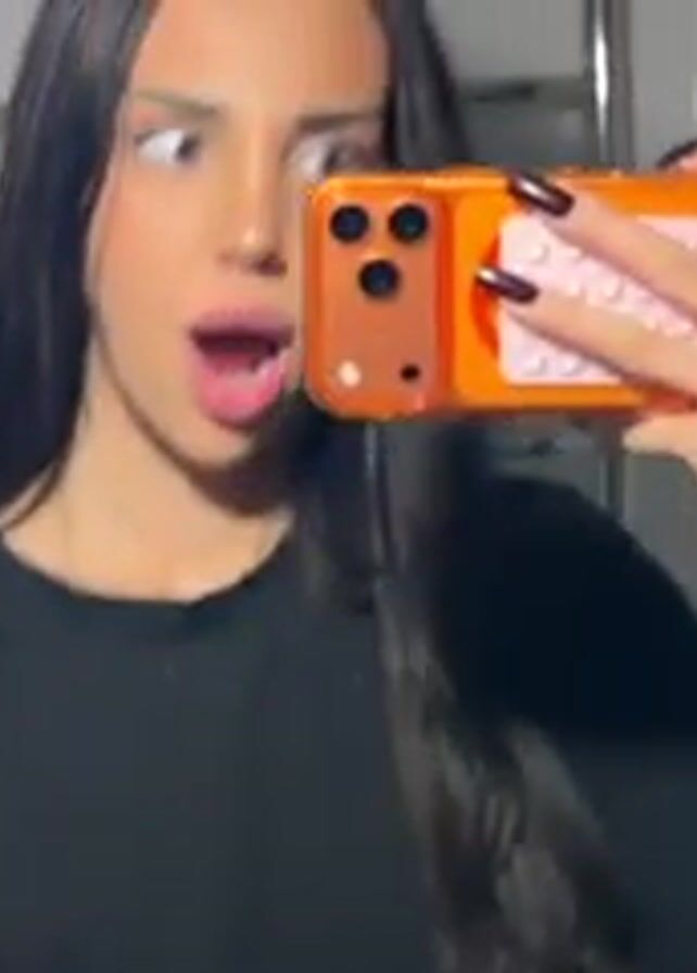 A woman with long dark hair is holding up an iPhone to take a selfie video of herself in a tiled bathroom