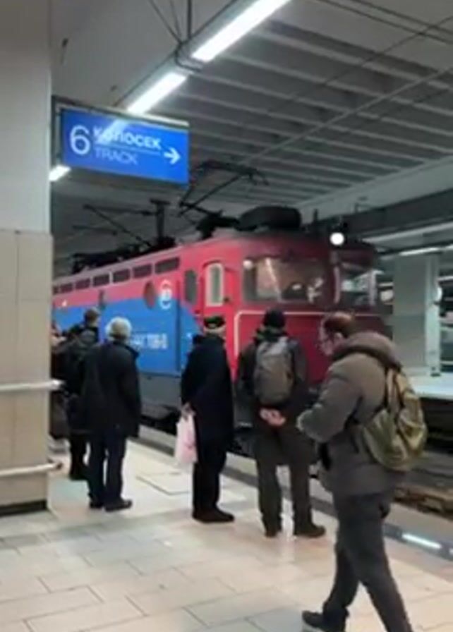 train arriving at a station, with people waiting on the platform. The train is painted in red, white, and blue. A sign above reads "6 KOLOŠEK TRACK" and points to the right. People are standing on the platform, facing the train. The train slows to a stop.