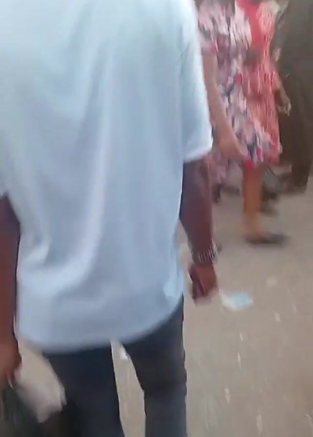 busy outdoor market scene. The camera follows a person in a light blue shirt and dark pants walking through the crowded area. There are several people around, some carrying items or displaying goods for sale. One person is riding a bicycle loaded with red goods. The ground appears to be paved but is littered with trash. The scene conveys a bustling, possibly chaotic atmosphere of commerce.