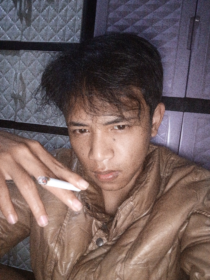A young male individual, with short dark hair and a neutral to serious expression, is depicted in a close-up, gazing directly forward at the camera. He is wearing a shiny, light brown, collared jacket with a visible snap button. His left hand is raised, holding a lit cigarette between his index and middle fingers, positioned to the lower left of his face. The cigarette exhibits a red glowing tip and white ash. The background features a light-colored, possibly grey, textured surface with a quilted or diamond pattern on the left, and a darker, likely purple, textured surface resembling cabinets or doors with a similar pattern on the right. A dark horizontal bar separates these background elements. The scene is set indoors, within the city of Pacet, Indonesia; the specific location within the city is not identifiable from the image.