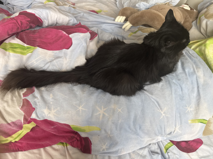 A black, long-haired feline subject is depicted resting on a bed in an indoor setting, located in Rostov-on-Don, Russia. The animal lies oriented horizontally, its body angled towards the right side of the frame, with its extended tail pointing towards the left. The head is slightly elevated and turned to the right, showcasing prominent, erect, pointed ears and distinctly spiky fur on its head. The bedding is light blue, patterned with white starbursts and large stylized floral designs in pink/magenta and green. A light brown plush toy, consistent with a sloth, is partially visible in the upper right background, positioned behind the feline.