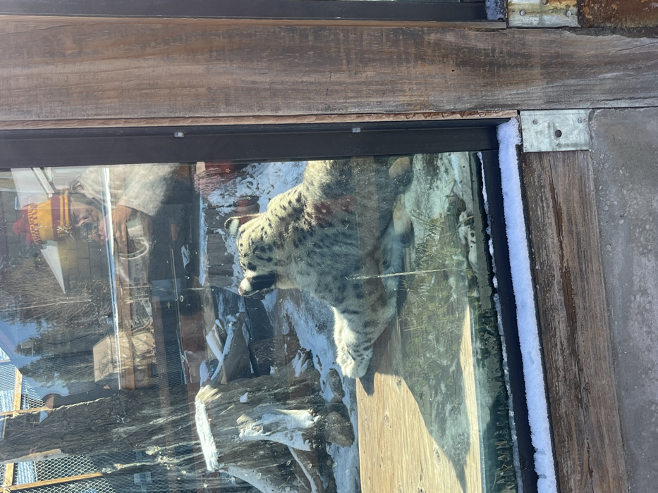 A snow leopard is visible behind a glass enclosure in an outdoor environment